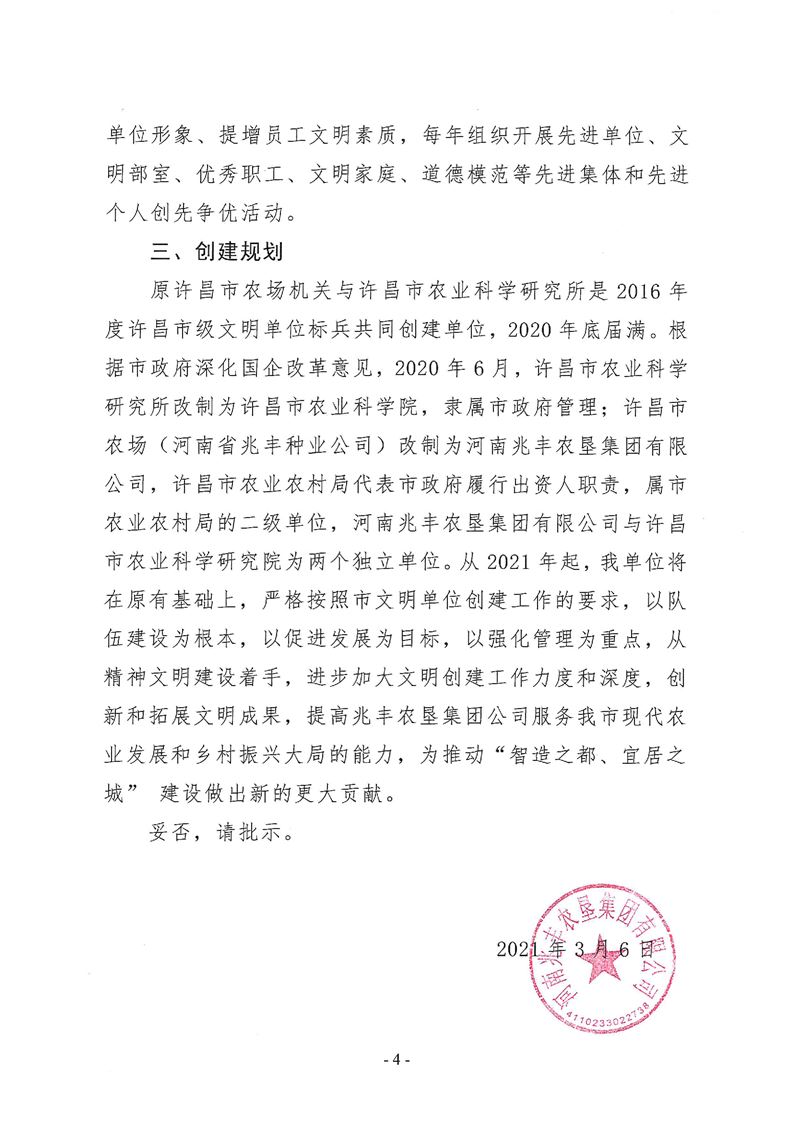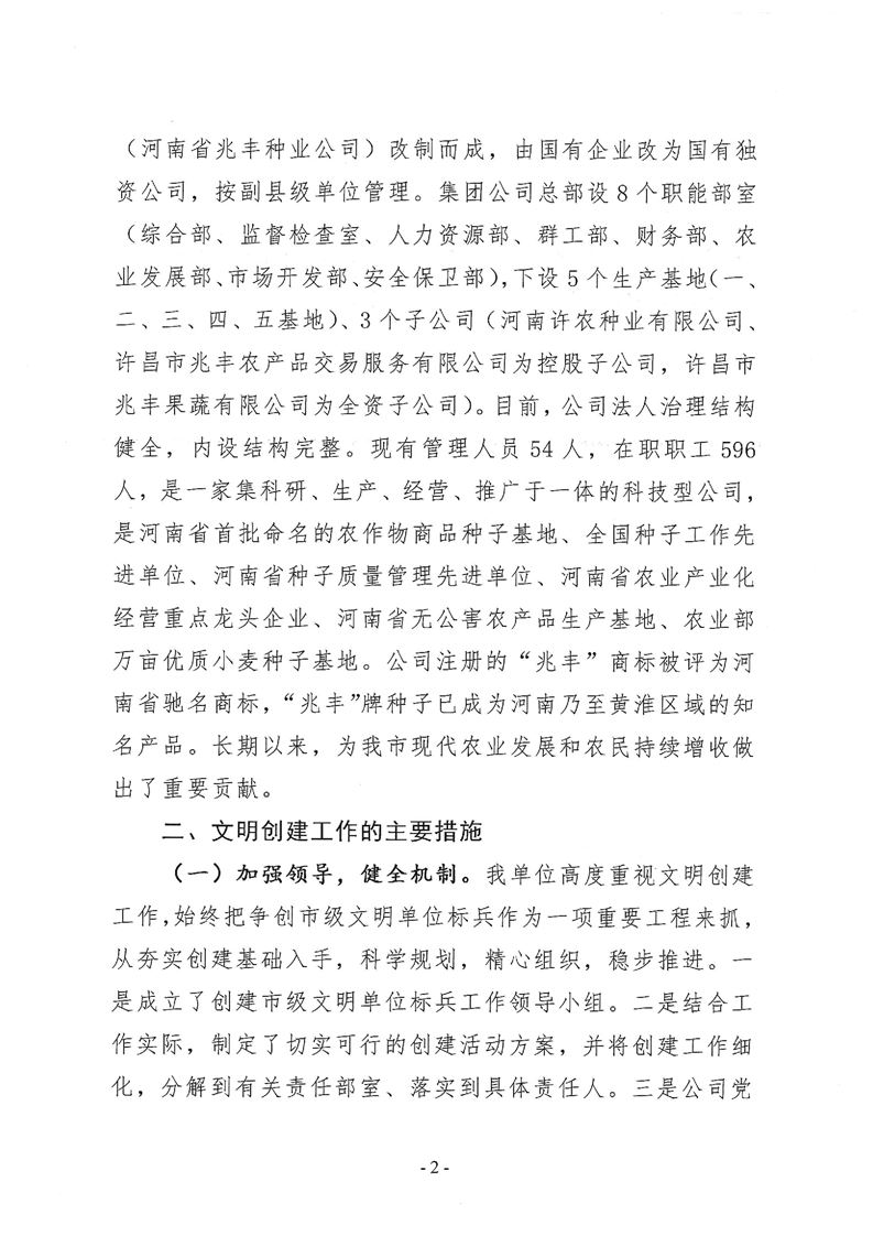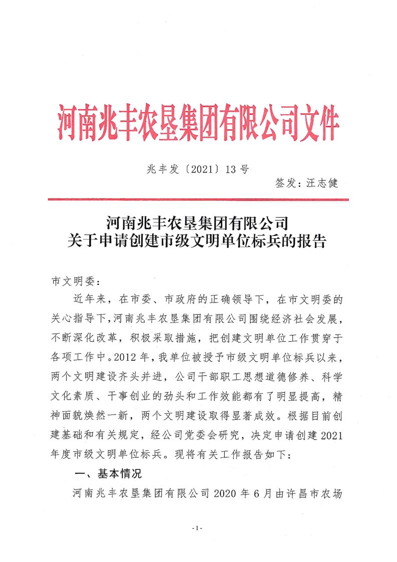 · 河南兆豐農墾集團有限公司 關于申請創建市級文明單位標兵的報告