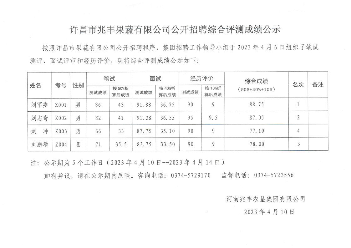 · 許昌市兆豐果蔬有限公司公開招聘綜合測(cè)評(píng)成績(jī)公示